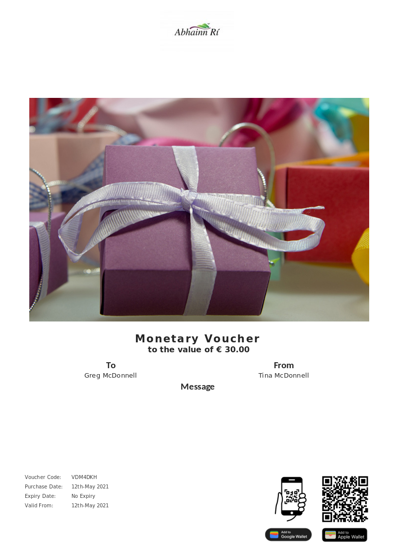 Abhainn Ri allows you to purchase instantly printable gift vouchers, special offers and tickets using the Voucher Connect platform.